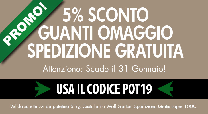 NOTE: Per usufriore dello sconto basta inserire il codice POT19 nello spazio CODICI SCONTO nella pagina carrello. Le spedizioni sono automaticamente gratuite per tutti gli ordini sopra i 100 euro e l'omaggio viene sempre inserito. La promozione è valida solo per attrezzi da potatura di Silky, Castellari e WOLF-Garten: forbici, cesoie, seghetti e troncarami. La scadenza della promozione è alle 24:00 del 31 Gennaio 2019.