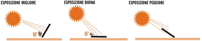 Per ottenere la massima produzione di energia i pannelli solari devono essere perpendicolari ai raggi solari. L'energia prodotta diminuisce con esposizioni non perpendicolari e diventa praticamente nulla se i raggi sono paralleli alla superficie del pannello.