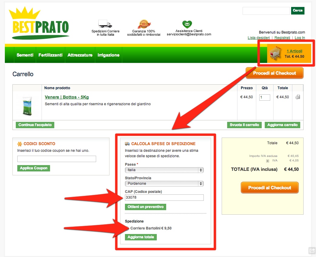 - Spostarsi nel carrello e compilare i campi provinica e cap di destinazione nel box CALCOLA SPESE DI SPEDIZIONE